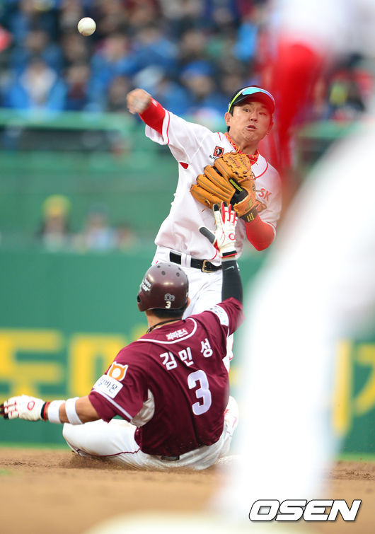 29일 인천 문학구장에서 벌어진 '2014 한국야쿠르트 세븐 프로야구' 개막전 SK 와이번스와 넥센 히어로즈의 경기 6회초 무사 1루 로티노의 내야땅볼때 김민성이 2루에서 포스아웃, 병살이 되고 있다.