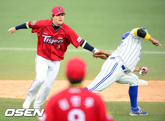 29일 오후 대구 시민구장에서 열린 '2014 한국야쿠르트 세븐 프로야구'삼성 라이온즈와 KIA 타이거즈의 개막전, 6회말 1사 주자 2루 삼성 이승엽의 1루수 병살타때 1루 주자 박석민이 런다운에 걸리며 KIA 유격수 김선빈에게 터치아웃을 당하고 있다.