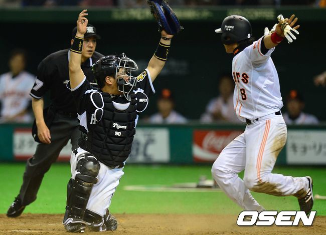 5회말 요미우리 공격 1사 2루 상황 무라타의 중전 안타 때 홈까지 내달린 가타오카가 한신 포수 후지이의 태그에 걸려 아웃 됐다. 심판의 콜을 요청하는 후지이와 가타오카.