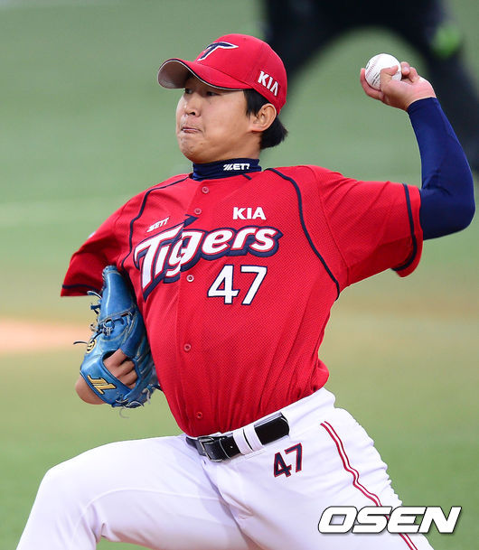 29일 오후 대구 시민구장에서 열린 '2014 한국야쿠르트 세븐 프로야구'삼성 라이온즈와 KIA 타이거즈의 개막전, 8회말 마운드에 오른 KIA 박경태가 힘차게 공을 뿌리고 있다.