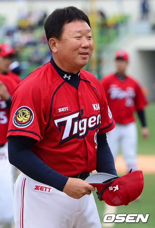 29일 오후 대구 시민구장에서 열린 '2014 한국야쿠르트 세븐 프로야구'삼성 라이온즈와 KIA 타이거즈의 개막전, 개막전 행사때 KIA 선발 선동열 감독이 미소지으며 인사를 하고 있다.