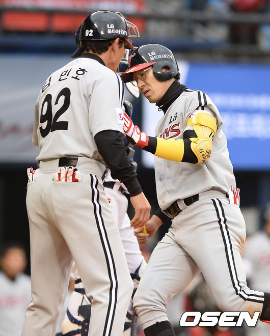 29일 오후 서울 잠실구장에서 열린 '2014 한국야쿠르트 세븐 프로야구' 두산 베어스와 LG 트윈스의 경기, 8회초 LG 선두타자 정성훈이 솔로홈런을 날리고 김민호 코치와 하이파이브를 하고 있다.