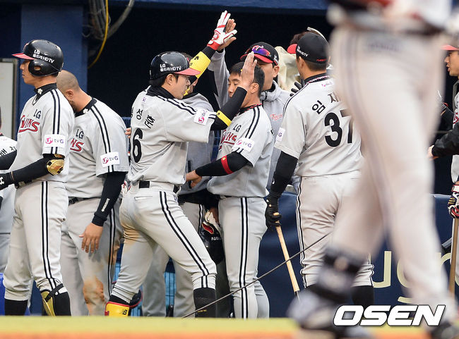 29일 오후 서울 잠실구장에서 열린 '2014 한국야쿠르트 세븐 프로야구' 두산 베어스와 LG 트윈스의 경기, 8회초 LG 선두타자 정성훈이 솔로홈런을 날리고 동료들과 기뻐하고 있다