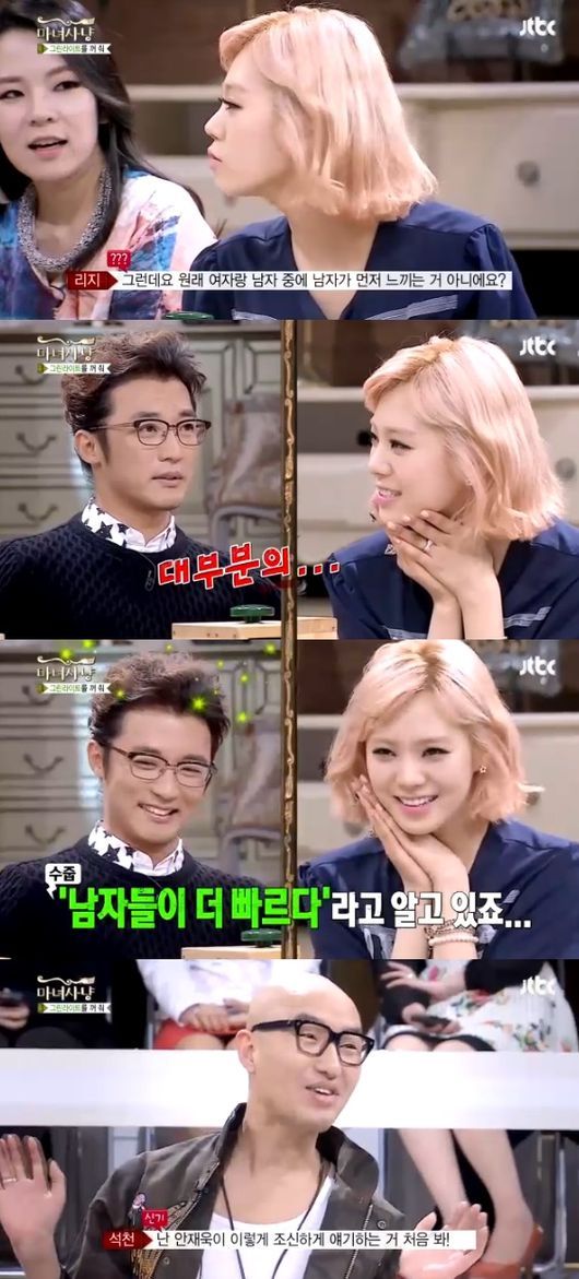 이어 “그런데 여자랑 남자 중에 남자가 먼저 느끼는 거 아니냐”고 돌발 질문을 했고 신동엽은 재치 있게 질문을 안재욱에게 넘겼다.