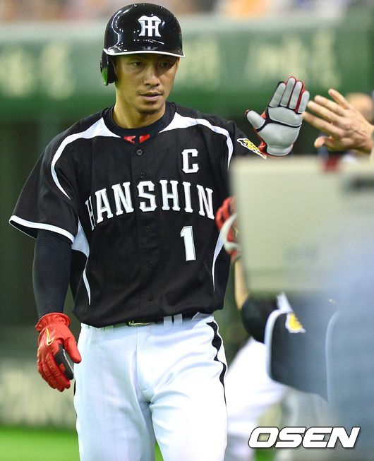 9회초 한신 공격 1사 2, 3루 상황 고메즈의 1타점 적시타로 득점에 성공한 도리타니 다카시가 더그아웃 동료들과 인사를 나누고 있다.