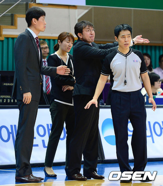 2쿼터 신한은행 임달식 감독이 심판 판정에 불만스러운 어필을 하고 있다.