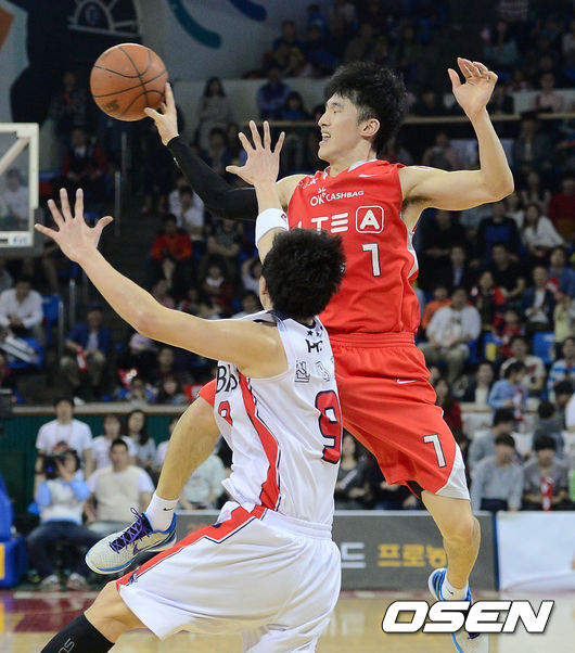29일 오후 서울 잠실학생체육관서 열린 2013-2014 프로농구 4강 플레이오프 4차전 서울 SK와 울산 모비스의 경기, 3쿼터 SK 변기훈이 패스시도하고 있다.