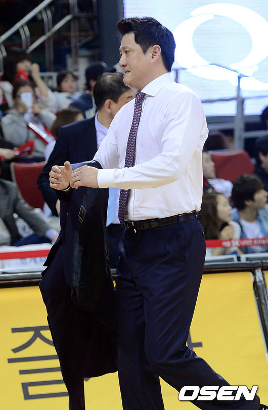 29일 오후 서울 잠실학생체육관서 열린 2013-2014 프로농구 4강 플레이오프 4차전 서울 SK와 울산 모비스의 경기, 하프타임때 SK 문경은 감독이 겉옷을 벗고 있다.