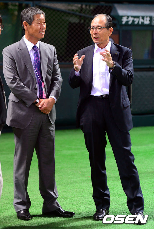 30일 오후 일본 후쿠오카 야후오크돔에서 열린 소프트뱅크 호스크와 지바 롯데 마린스의 경기에 앞서 고양 원더스 김성근 감독이 경기장을 찾아 소프트뱅크 오 사다하루 회장과 이야기를 나누고 있다.