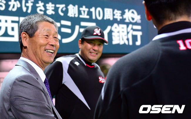 30일 오후 일본 후쿠오카 야후오크돔에서 열린 소프트뱅크 호스크와 지바 롯데 마린스의 경기에 앞서 고양 원더스 김성근 감독이 경기장을 찾아 지바롯데 선수들과 이야기를 나누고 있다.