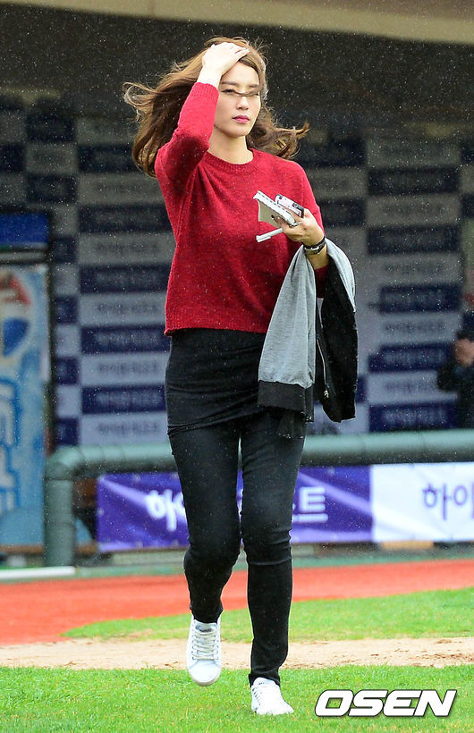 30일 오후 부산 사직구장에서 열리는 '2014 한국야쿠르트 세븐 프로야구' 롯데 자이언츠와 한화 이글스의 경기 시작전 정인영 아나운서가 비를 피해 뛰고 있다.