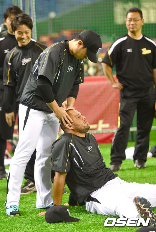 '끝판대장' 오승환이 30일 오후 일본 도쿄돔에서 열리는 '2014 일본프로야구' 요미우리 자이언츠 대 한신 타이거스의 경기를 앞두고 팀 동료 고메즈에게 마사지를 해주고 있다.