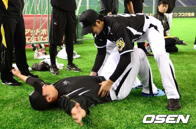 '끝판대장' 오승환이 30일 오후 일본 도쿄돔에서 열리는 '2014 일본프로야구' 요미우리 자이언츠 대 한신 타이거스의 경기를 앞두고 이토 코치와 대화를 나누고 있다.