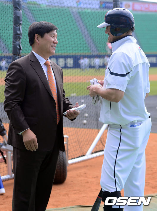 30일 오후 서울 잠실구장에서 열린 '2014 한국야쿠르트 세븐 프로야구' 두산 베어스와 LG 트윈스의 경기에 앞서 허구연 해설위원이 두산 칸투와 이야기를 나누고 있다.