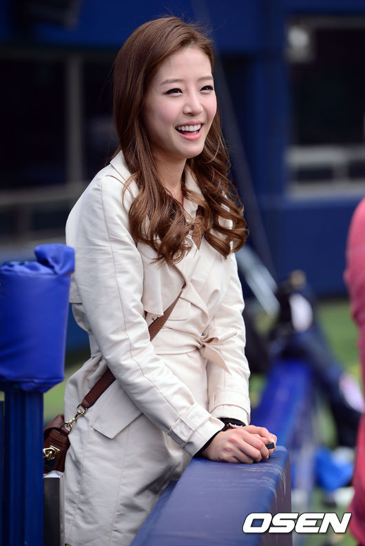 30일 오후 서울 잠실구장에서 열린 '2014 한국야쿠르트 세븐 프로야구' 두산 베어스와 LG 트윈스의 경기에 앞서 배지현 전 아나운서가 야구장을 찾아 관계자와 이야기를 나누고 있다.