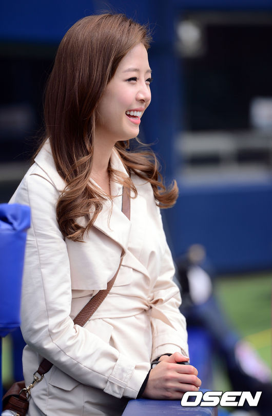 30일 오후 서울 잠실구장에서 열린 '2014 한국야쿠르트 세븐 프로야구' 두산 베어스와 LG 트윈스의 경기에 앞서 배지현 전 아나운서가 야구장을 찾아 관계자들과 이야기를 나누고 있다.