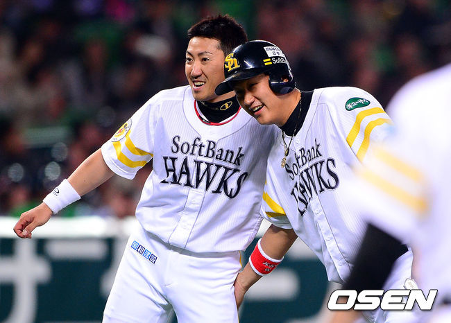 1회말 종료 후 소프트뱅크 이대호가 우치카와 세이치와 이야기를 나누고 있다.