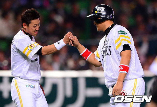 1회말 종료 후 소프트뱅크 이대호가 우치카와 세이치와 이야기를 나누고 있다.