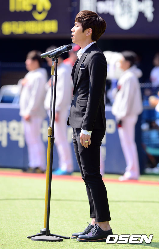 30일 오후 서울 잠실구장에서 열린 '2014 한국야쿠르트 세븐 프로야구' 두산 베어스와 LG 트윈스의 경기에 앞서 가수 케이윌이 애국가를 제창한후 퇴장하고 있다.
