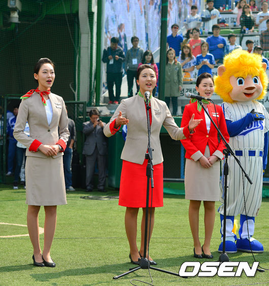 30일 오후 대구 시민구장에서 열린 '2014 한국야쿠르트 세븐 프로야구' 삼성 라이온즈와 KIA 타이거즈의 경기, 경기 전 티웨이 항공 여승무원(스튜어디스)들이 애국가를 열창하고 있다.