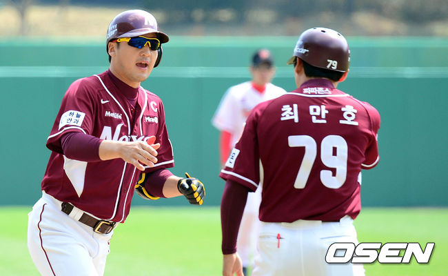 1회초 1사 1루에서 넥센 이택근이 좌월 투런 홈런을 날리고 최만호 코치와 하이파이브를 하고 있다.
