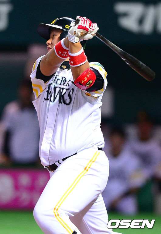 3회말 1사 2루 소프트뱅크 이대호가 안타를 때리고 있다.