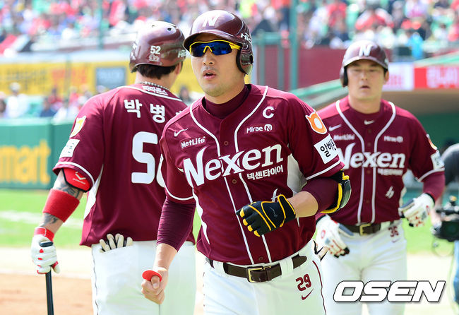 1회초 1사 1루에서 넥센 이택근이 좌월 투런 홈런을 날리고 홈을 밟고 있다.