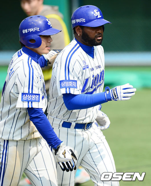 30일 오후 대구 시민구장에서 열린 '2014 한국야쿠르트 세븐 프로야구' 삼성 라이온즈와 KIA 타이거즈의 경기, 1회말 무사 주자 1루 삼성 나바로가 좌월 투런 홈런을 날린 후 홈에서 정형식과 기쁨을 나누고 있다.