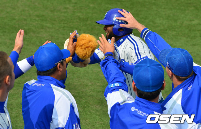 30일 오후 대구 시민구장에서 열린 '2014 한국야쿠르트 세븐 프로야구' 삼성 라이온즈와 KIA 타이거즈의 경기, 1회말 무사 주자 1루 삼성 나바로가 좌월 투런 홈런을 날린 후 덕아웃에서 동료들과 기쁨을 나누고 있다.