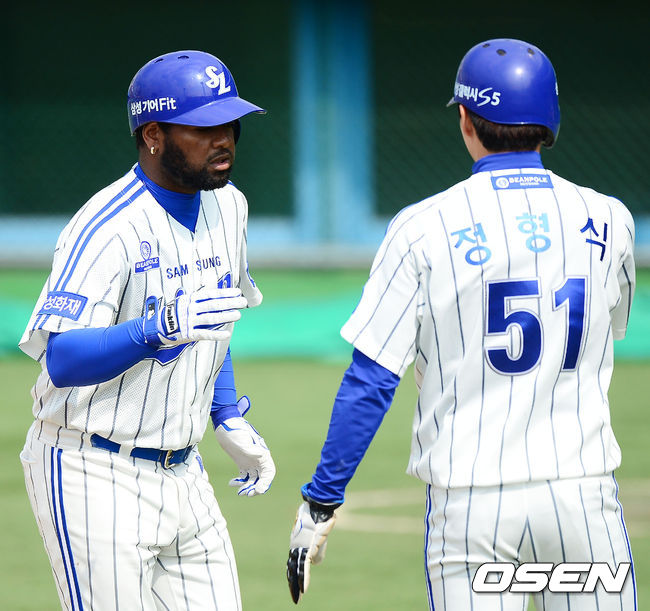 30일 오후 대구 시민구장에서 열린 '2014 한국야쿠르트 세븐 프로야구' 삼성 라이온즈와 KIA 타이거즈의 경기, 1회말 무사 주자 1루 삼성 나바로가 좌월 투런 홈런을 날린 후 홈에서 정형식과 기쁨을 나누고 있다.