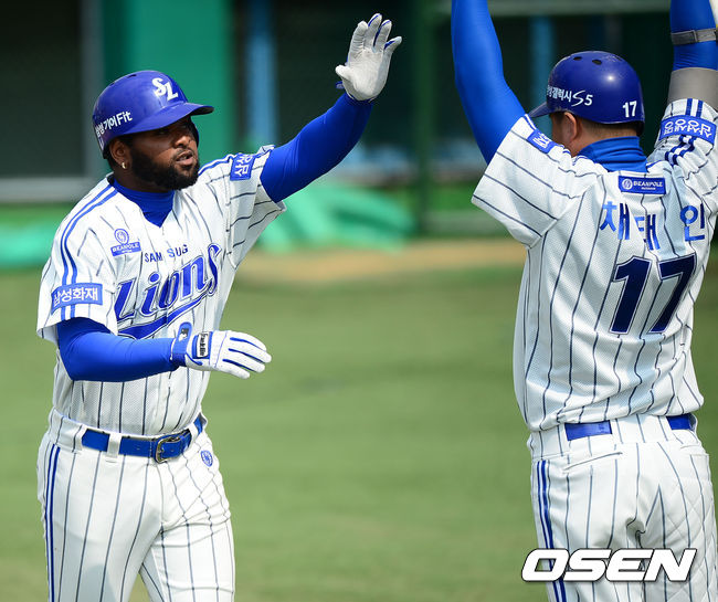 30일 오후 대구 시민구장에서 열린 '2014 한국야쿠르트 세븐 프로야구' 삼성 라이온즈와 KIA 타이거즈의 경기, 1회말 무사 주자 1루 삼성 나바로가 좌월 투런 홈런을 날린 후 홈에서 정형식과 기쁨을 나누고 있다.