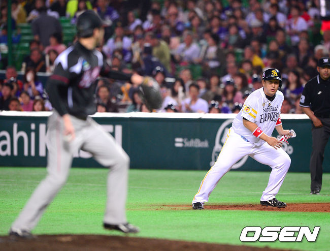 3회말 1사 1,3루 소프트뱅크 이대호가 지바롯데 이시카와 아유무의 1루 견제때 황급히 귀루하고 있다.
