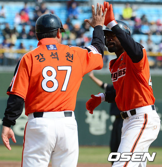 30일 오후 부산 사직구장에서 열린 '2014 한국야쿠르트 세븐 프로야구' 롯데 자이언츠와 한화 이글스의 경기 2회초 2사 만루 피에가 2타점 적시타를 치고 강석천 코치와 하이파이브를 하고 있다.