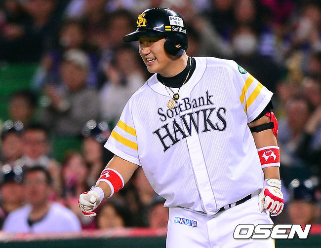 3회말 1사 2루 소프트뱅크 이대호가 안타를 때린 뒤 기뻐하고 있다.
