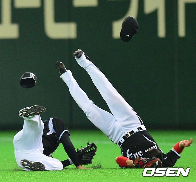 2회말 요미우리 공격 2사 1, 2루 상황 9번 오오타케 칸의 플라이 타구를 처리하려던 한신 2루수 니시오카 쓰요시(오른쪽)와 우익수 후쿠도메 고스케가 충돌한 뒤 넘어지고 있다.