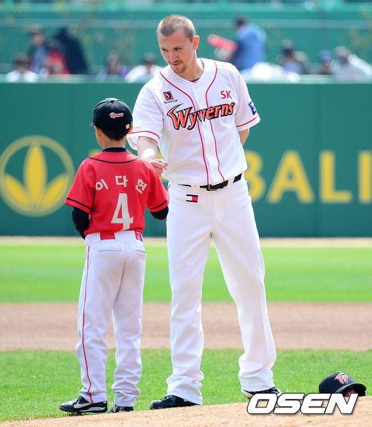 경기에 앞서 SK 선발투수 울프가 마운드에 오른 어린이 팬과 하이파이브를 하고 있다.