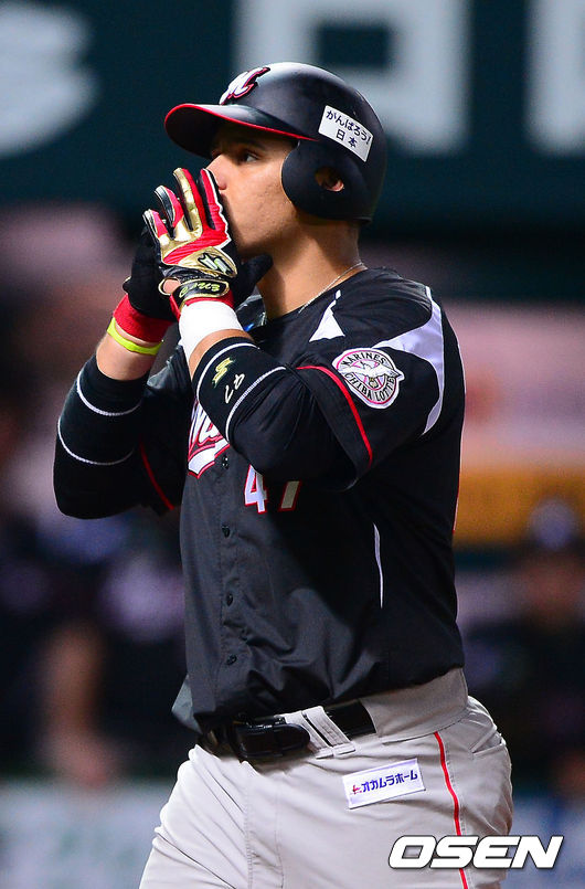 5회초 1사 지바롯데 루이스 크루즈가 홈런을 때린 뒤 세레머니를 하고 있다.