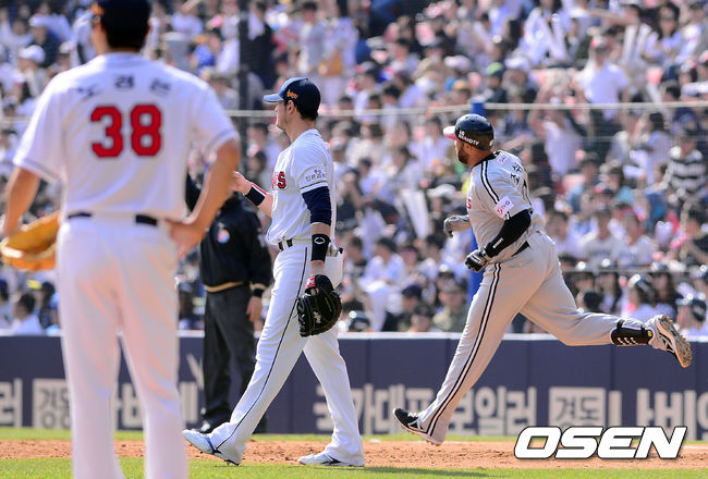30일 오후 서울 잠실구장에서 열린 '2014 한국야쿠르트 세븐 프로야구' 두산 베어스와 LG 트윈스의 경기,3회초 1사 1루 LG 조쉬벨이 2점 홈런을 날리고 베이스를 돌고 있다.