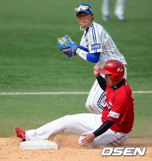30일 오후 대구 시민구장에서 열린 '2014 한국야쿠르트 세븐 프로야구' 삼성 라이온즈와 KIA 타이거즈의 경기, 3회초 1사 주자 만루 KIA 신종길의 2루수 앞 땅볼때 1루 주자 이범호가 삼성 유격수 김상수에게 포스아웃을 당하고 있다.