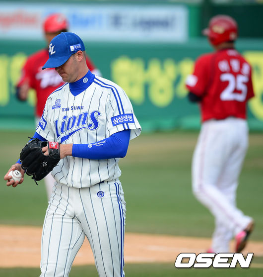 30일 오후 대구 시민구장에서 열린 '2014 한국야쿠르트 세븐 프로야구' 삼성 라이온즈와 KIA 타이거즈의 경기, 3회초 무사 주자 만루 타석에 있는 KIA 이범호의 몸에 볼을 맞춰 동점을 허용한 밴덴헐크가 고개를 숙이고 있다.