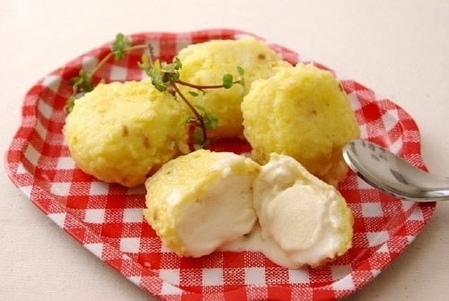 아이스크림을 적당한 크기로 잘라 빵가루 위로 굴린 후, 빵가루가 묻은 아이스크림을 그대로 냉동실에 2시간 가량 얼린다. 빵가루가 아이스크림에서 떨어지지 않을 정도로 얼려야 한다.