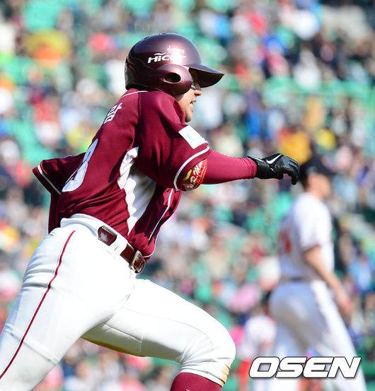 4회초 2사에서 넥센 문우람이 우중간을 가르는 안타를 치고 그라운드를 달리고 있다.