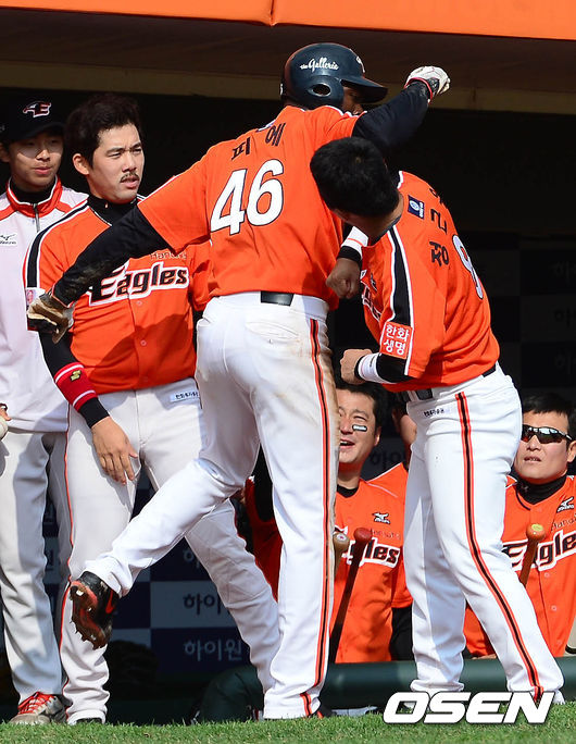 30일 오후 부산 사직구장에서 열린 '2014 한국야쿠르트 세븐 프로야구' 롯데 자이언츠와 한화 이글스의 경기 4회초 2사 2루 김태균의 적시 2루타에 홈을 밟은 피에가 덕아웃에서 정근우와 세레모니를 하고 있다.