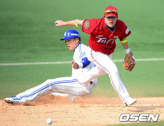 30일 오후 대구 시민구장에서 열린 '2014 한국야쿠르트 세븐 프로야구' 삼성 라이온즈와 KIA 타이거즈의 경기, 4회말 1사 주자 1루 삼성 박한이의 2루수 앞 땅볼때 KIA 2루수 안치홍의 실책으로 유격수 김선빈이 볼을 잡아내지 못하고 있다.