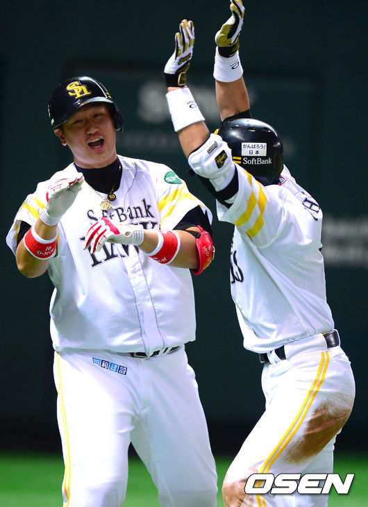 8회말 선두타자로 나선 소프트뱅크 우치카와 세이치가 솔로 홈런을 때린 뒤 이대호와 기뻐하고 있다.