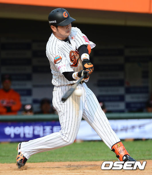 30일 오후 부산 사직구장에서 열린 '2014 한국야쿠르트 세븐 프로야구' 롯데 자이언츠와 한화 이글스의 경기 5회말 선두타자 문규현이 우중간 2루타를 치고 있다.