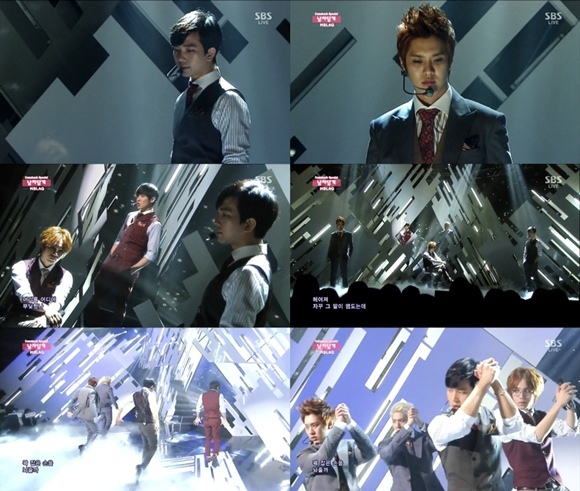 엠블랙은 30일 오후 생방송으로 진행된 SBS '인기가요'에 출연해 6번째 미니앨범 타이틀곡 '남자답게' 무대를 공개했다.
