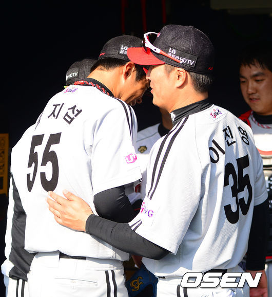 30일 오후 서울 잠실구장에서 열린 '2014 한국야쿠르트 세븐 프로야구' 두산 베어스와 LG 트윈스의 경기,5회말 이닝종료후 LG 선발투수 임지섭이 이진영과 이야기를 나누고 있다. 임지섭은 5회까지 승리투수 요건을 갖추었다.