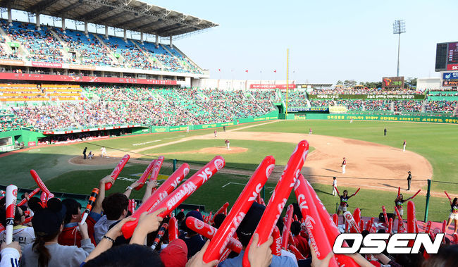 경기장을 가득 메운 팬들이 열띤 응원을 펼치고 있다.