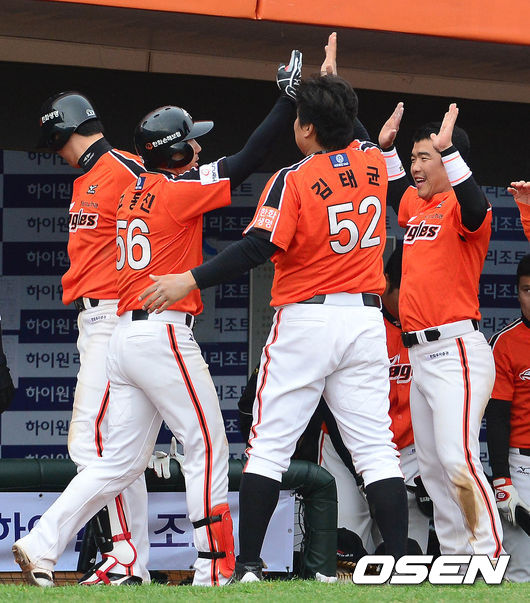 30일 오후 부산 사직구장에서 열린 '2014 한국야쿠르트 세븐 프로야구' 롯데 자이언츠와 한화 이글스의 경기 7회초 2사 고동진이 솔로포를 치고 덕아웃에서 동료들과 하이파이브를 하고 있다.